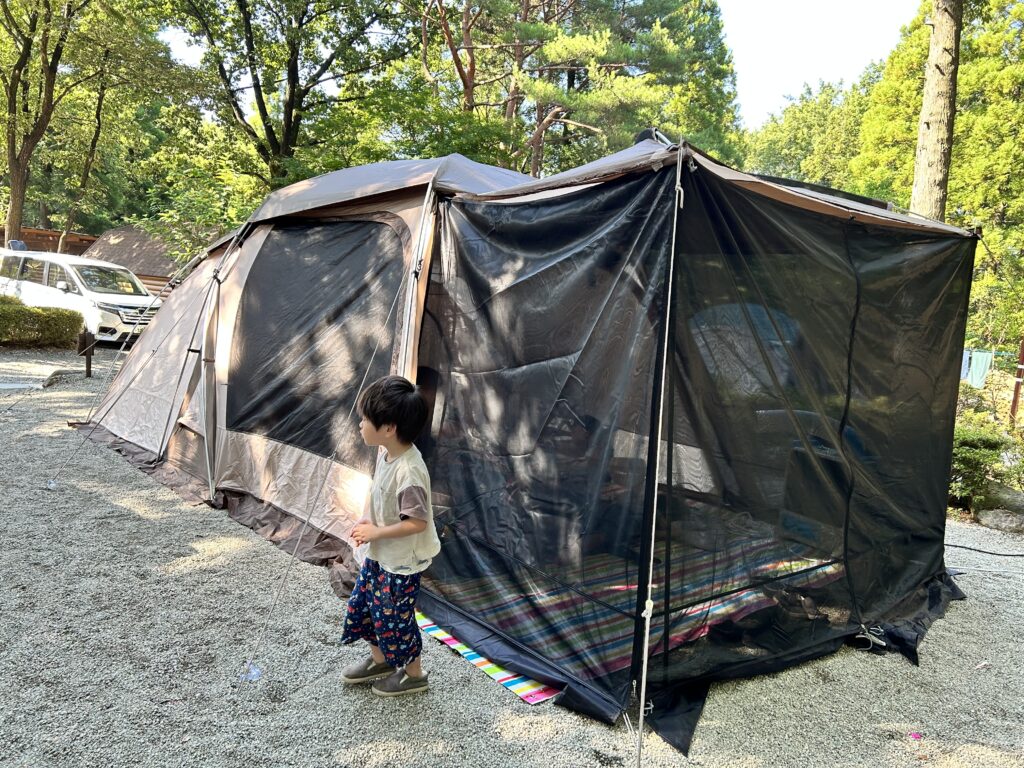 虫が思ったほどにいません。(夏キャンプは経験少ないのですが、8月のキャンプではカメムシもクモも見ていません。蚊や蝿はいるものの、テントに飛んできたのはセミとトンボと蝶くらいでした。)